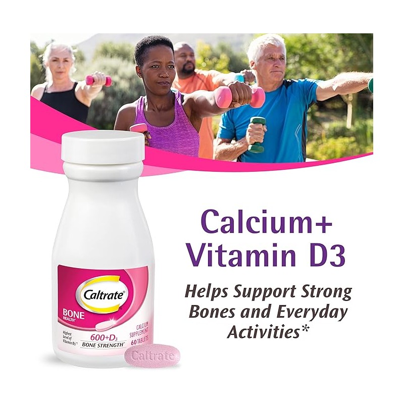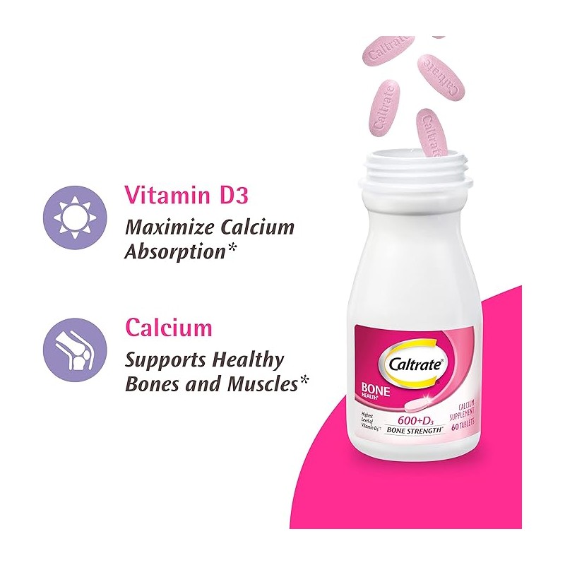Caltrate 600 Plus D3 Calcium and Vitamin D Supplement Tablets offer the highest level of vitamin D3 (1) to help maximize calcium absorption and support healthy bones, joints and muscles. (2) Formulated with calcium carbonate�nature's most concentrated form of calcium�Caltrate bone health supplements contain 600 mg of calcium per tablet. Your body needs calcium for more than just strong bones; it also plays a role in supporting everyday activities like muscle contractions, blood clotting and nerve function. In addition to calcium, your body needs vitamin D to help calcium work for you. Caltrate calcium with vitamin D supplements contain high levels of vitamin D3 to help maximize calcium absorption and maintain healthy bones. (2) Take one to two tablets daily with food, or take these bone support supplements as directed by a physician to get the calcium and vitamin D your body needs to support healthy bones and muscles and keep you moving. (2) Caltrate calcium supplements are also available in 600 Plus D3 plus Minerals. (1) Per tablet; among leading calcium supplement brands. (2) These statements have not been evaluated by the Food and Drug Administration. These products are not intended to diagnose, treat, cure or prevent any disease.