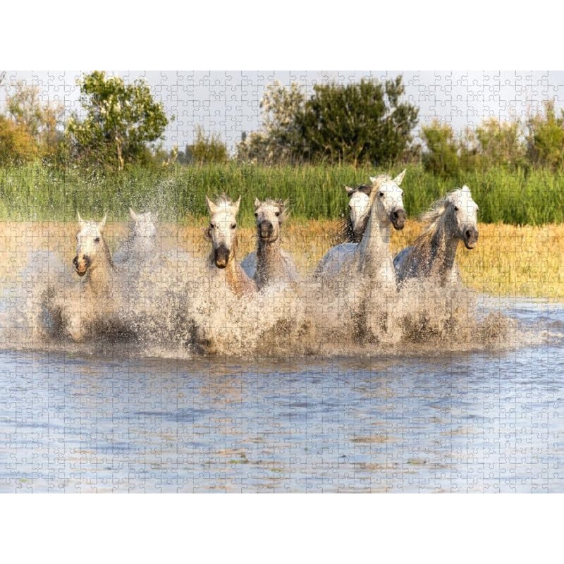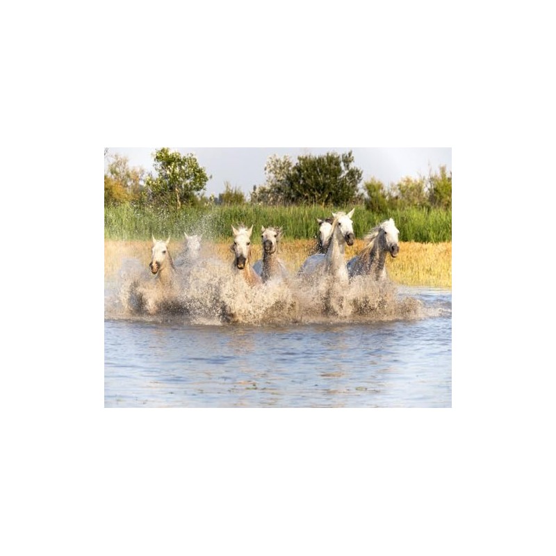 The cooling waters of the Camargue marshes are stormed by the white wild horses full of joie de vivre - the water splashes up - the manes fly in the wind