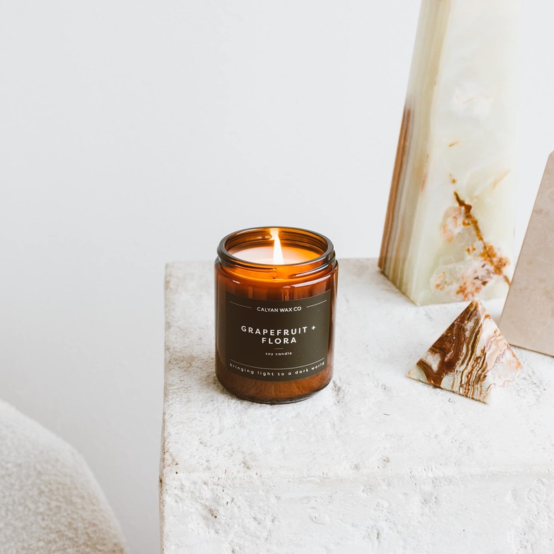 Calyan Wax Co. Candle, Grapefruit + Flora Scented Candle, 57 Hour Burn Time, Aromatherapy Soy Candles, Non Toxic & Vegan Soy Wax, Amber Glass Jar Scented Candles, 7.2oz