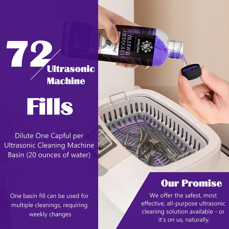 - UNPARALLELED DILUTION EFFICIENCY: Crafted exclusively in the USA, our concentrated ultrasonic cleaning solution offers impressive dilution ratios of 1:140 with water or one capful per 20 ounces of water to fill your ultrasonic jewelry cleaner machine basin. With two bottles, enjoy 72 basin fills, providing multiple uses and long-lasting cleaning power.