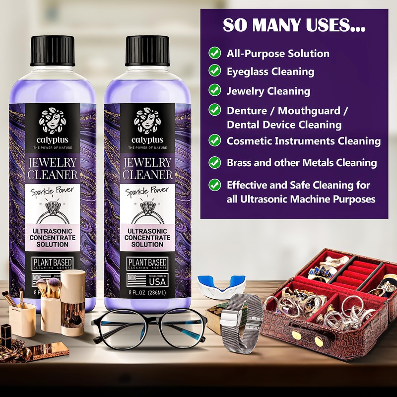 - THE ULTIMATE ALL-PURPOSE SOLUTION: From jewelry and eyeglasses to dentures, mouthguards, brass, and more, our ultrasonic cleaner solution handles all your cleaning needs with ease. Say goodbye to multiple specialized cleaners and embrace the convenience of one solution for everything.