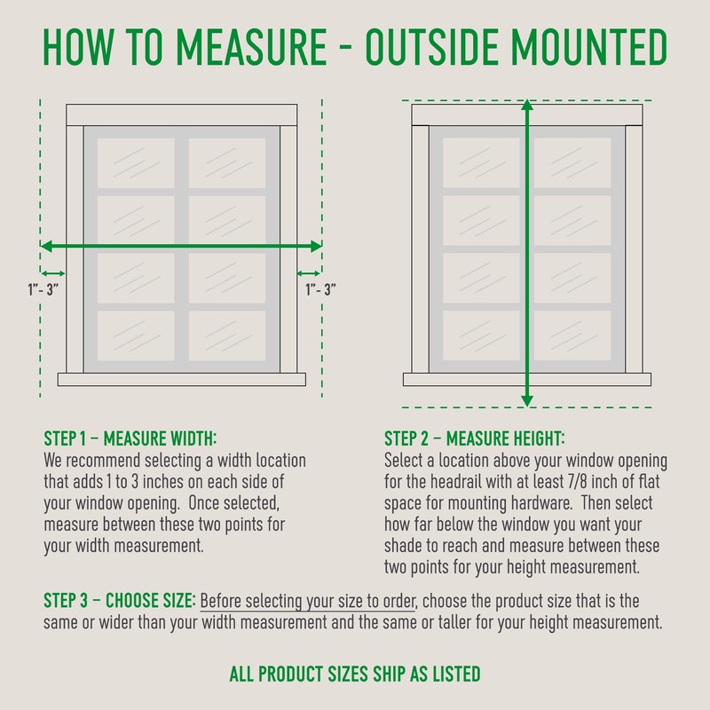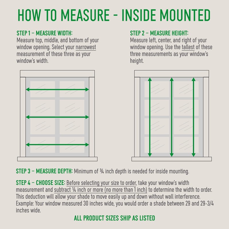 - Attention: How to Measure for Inside Mount: The blind you order will be the exact size with no deductions. To ensure a proper fit, measure the width of your window at the top, middle, and bottom. For a 38.5" wide blind, your window should measure between 38.75" to 39.5" wide, allowing for a snug fit with minimal light gaps. Next, measure the height from the top of the window to the windowsill on the left, middle, and right sides, and use the largest height measurement when placing your order.