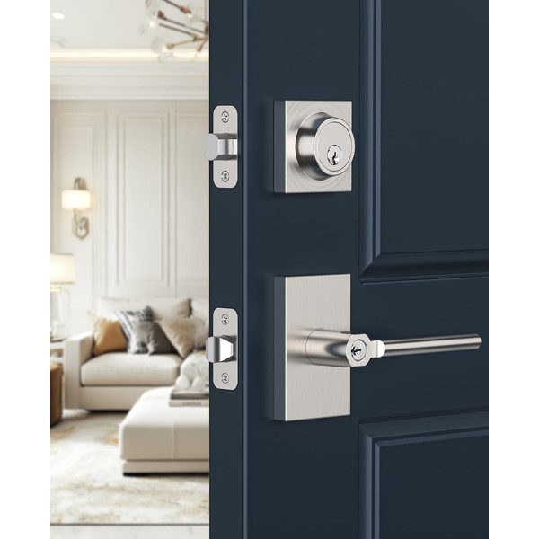 Upgrade your home security and style with this heavy-duty exterior door knob with deadbolt. Crafted from premium zinc alloy, this exterior door lock set with deadbolt offers a solid, weatherproof structure tested for over 250,000 uses, ensuring reliable performance all year round. For added security and convenience, this deadbolt lock set features double locks keyed alike, so you can secure your door with one key—ideal for homes, offices, or rental properties. It includes 3 keys for easy access sharing. Designed to fit standard doors 1-3/8"" to 1-3/4"" thick, the adjustable latch accommodates both 2-3/8"" and 2-3/4"" backsets, making this satin nickel door knob suitable for most entryways. Plus, the reversible lever makes installation easy on both right- or left-handed doors. With a modern satin nickel finish, this brushed nickel front door handle set brings a sleek, elegant touch while resisting corrosion in different weather conditions. Whether you're upgrading your front, back, or garage entrance, this back door lock set with deadbolt ensures durability and style. No professional tools? No problem. The package includes all necessary parts, a clear instruction manual, and an installation video, making the process easy even for beginners. Use the included template to mark the correct hole position and complete your entry door handle set installation with no hassle. Whether you're looking for cerraduras para puertas exteriores, an outside door handle, or a dependable door knob with deadbolt, this set provides the great balance of security, durability, and modern aesthetics for any entry point.