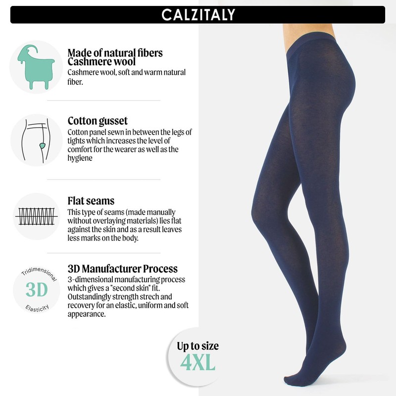CALZITALY Cashmere Wool Tights – Fleece Lined Warm Pantyhose for Women, S, M, L, XL, XXL, 3XL, 4XL, 150 DEN (S, Blue)