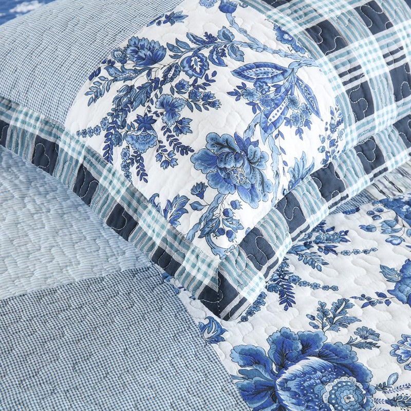 - Rustic Real Patchwork Quilt: The rustic style quilt features a plaid patchwork design. Blue floral patterns paired with blue and white solid colour patterns to bring a fresh feel to your bedroom.