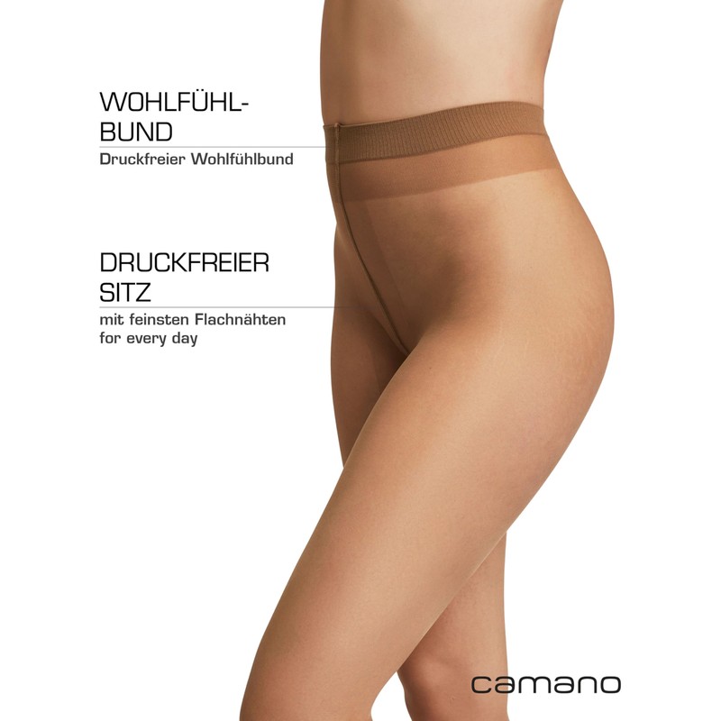 The transparent 20 denier tights accompany the wearer reliably and comfortably through everyday life: with the attractive matte look and a ring-free, even mesh pattern, they look particularly natural and flatters women's legs.