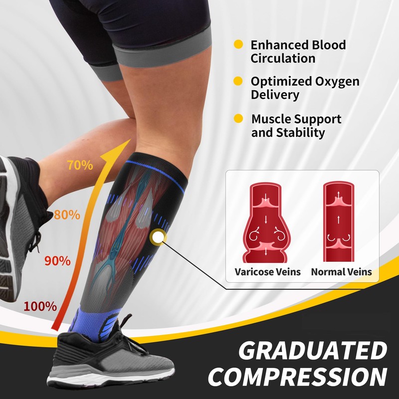 - Breathable and Long-Lasting: Made with 80% polyester, 10% latex, 8% nylon, and 2% spandex; utilize 3D knitting technology to offer a balance of flexibility, breathability, and Steady; the moisture-wicking feature keeps your calves and feet dry and eliminates annoying blisters; firmly knitted to provide optimal support and maintain compression even after repeated washing