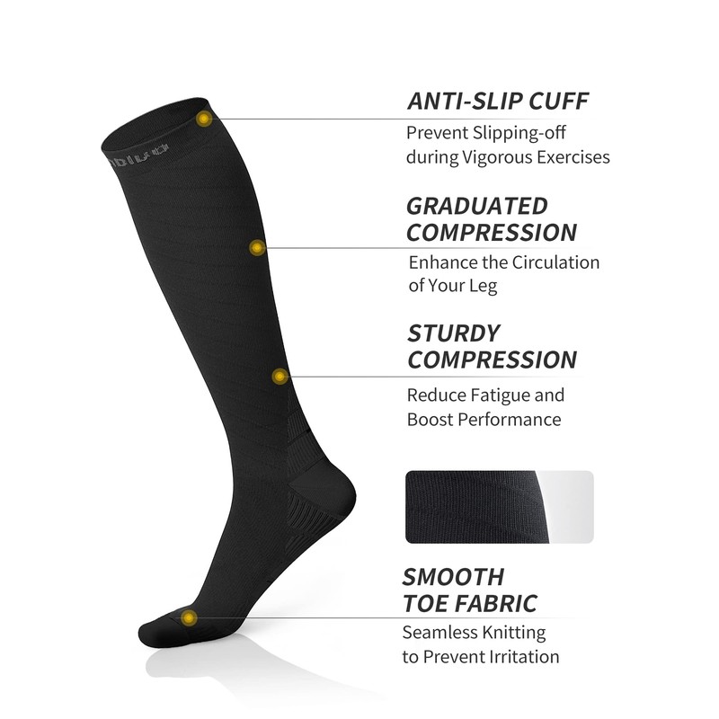 - DETAILED DESIGN The compression socks feature a non-slip strip and reinforced heel to prevent slipping. The toe area is smooth and seamless, which further improves wearing comfort.