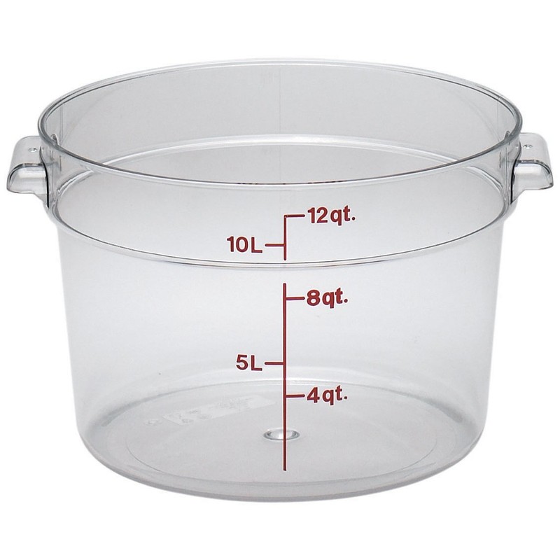 Manufacturer Part Number: RFSCW12; Inner Diameter x Depth; Capacity: 12.0 x 8.1 inches (306 x 205 mm); CAMBRO Cambro Food Container; US; NSF Washer Compatible Material: Polycarbonate (Heat Resistant Temperature: -40 - 99 °C); This popular round food container is perfect for storing and transporting food. Clear body for easy identification of contents Convenient red markings are also included. The shape of the container promotes proper air circulation, and the heat resistant temperature is from .40 to 99 degrees Celsius so you can quickly cool or freeze large amounts of food. Made of sturdy polycarbonate for durability. Resistant to acids, oils, alcohol, and does not tarnish. The integrated handle makes it easy to carry. Can be stacked There is also a cover to prevent spills during transport. Dishwasher safe