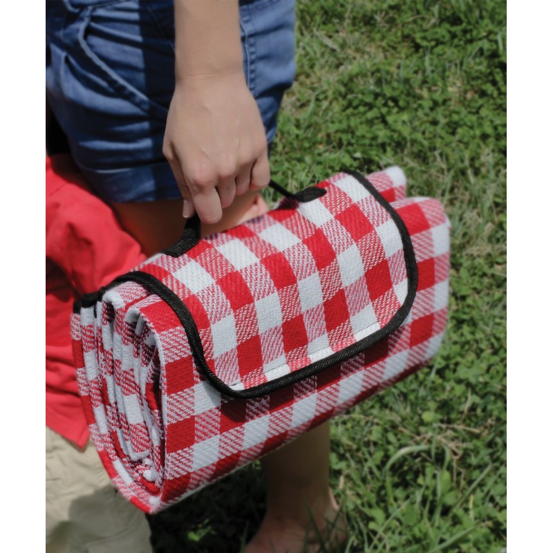Camco's Picnic Blanket is great for outdoor outings such as picnics, tailgating, camping or as an emergency blanket in your RV. It measures 51" x 59" and is red and white. Its durable waterproof backing with foam cushioning adds comfort and insulation. The hoop-and-loop fastener keeps the blanket folded for storage. It folds compactly to 3" x 8.5" x 13".