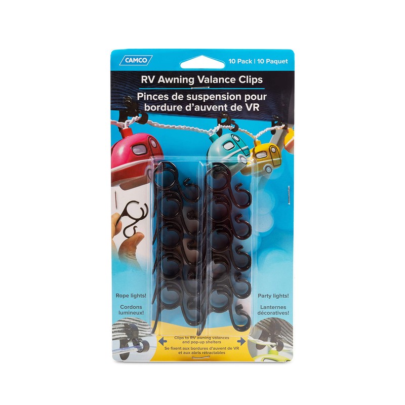 Camco RV Awning Valance Clips - Easily Hang Rope or Party Lights from Your RV's Awning Valance or Pop-Up Shelter - Includes a Pack of (10) Clips (42709)