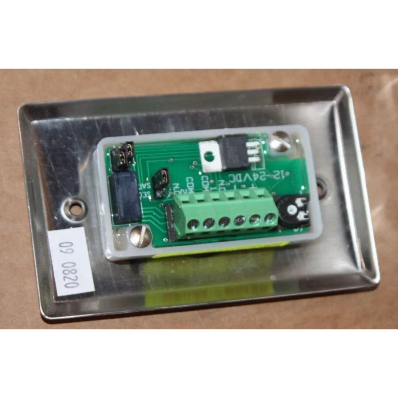 CM-9600 is single gang width (2-3/4"), perfect for door frames or narrow areas. The large 1" round diameter button is easy to activate. Illumination and power relay is 12 to 24 VDC. Switch illumination is jumper selectable and may be set for On, Off, Green to Red, Red to Green or non-lit operation. Field selectable for N/O or N/C contact output and fail safe/fail secure operation.