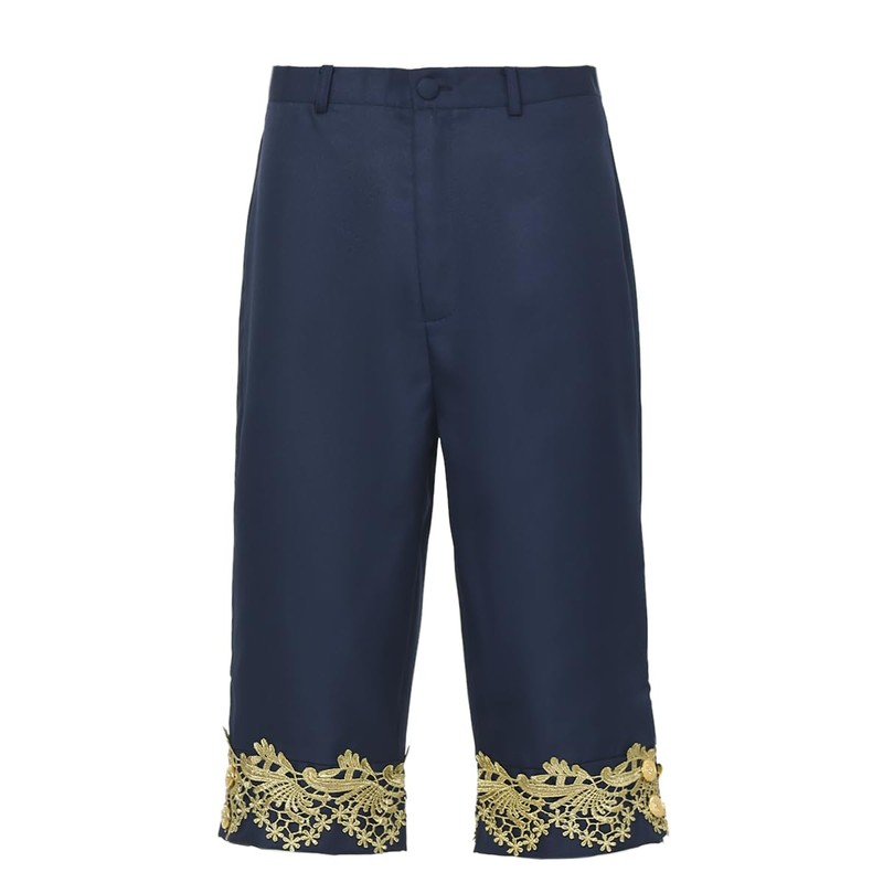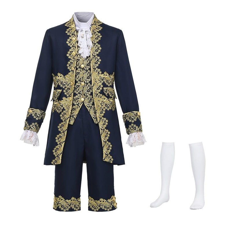 - 8 Pc including: 1 coat + 1 pants + 1 vest + 1 tie + 1 pair of wrist cuffs + 1 pair of stockings.