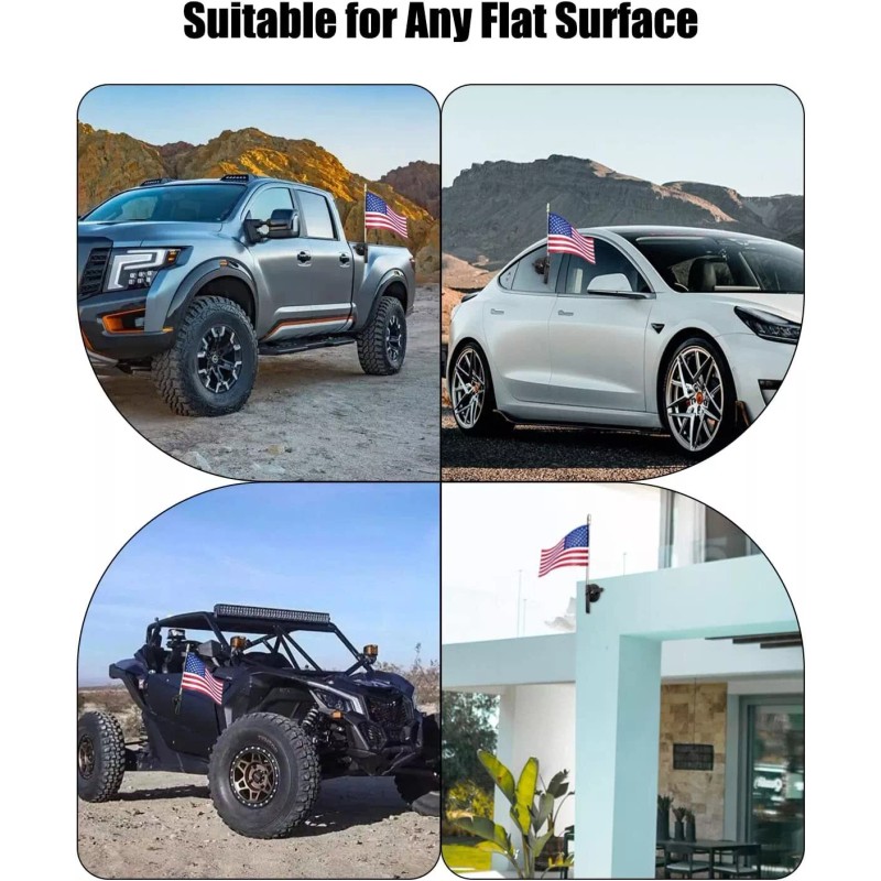 - Multifunctional Flagpole Bracket: This universal metal flag pole bracket can be widely used in cars, house walls or other flat surfaces. It can be used for RV, truck, car, boat, ATV and other vehicles, and can also be used for house decoration, installed on flat walls and other planes