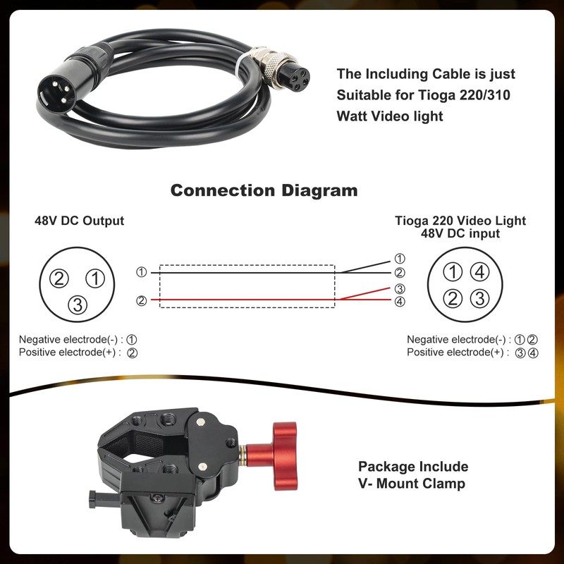 - The 48V DC Dual V-Mount Battery Power Station package includes a V mount clamp and a cable for the Tioga series lights (Battery not include )
