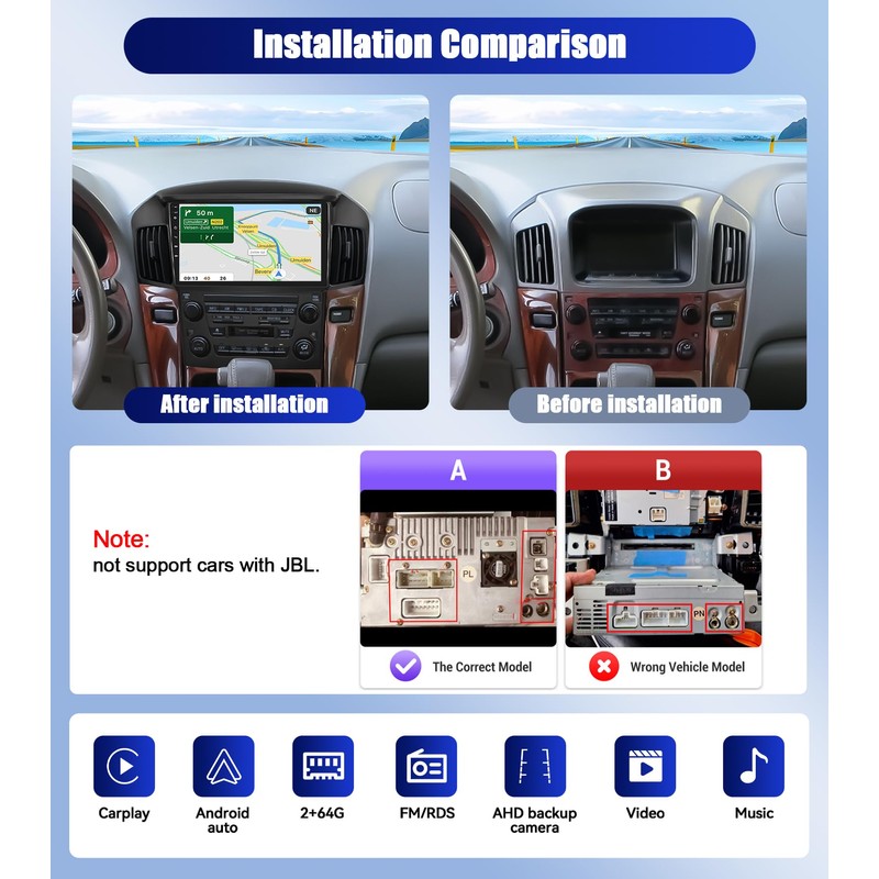 - 【For Lexus RX300 / Toyota Harrier 1997-2003】This car radio for Lexus RX300 / Toyota Harrier 1997-2003 with android 13 system, 2G+64G. Note: this car support basic navi version, not support car with JBL