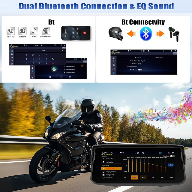 - Dual Bluetooth design and EQ sound: With Bluetooth, you can quickly pair the carplay, and at the same time you can connect the headset or helmet. EQ sound is clear and the signal transmission is stable. You don't have to stop and answer the phone, but can focus on driving and safety.