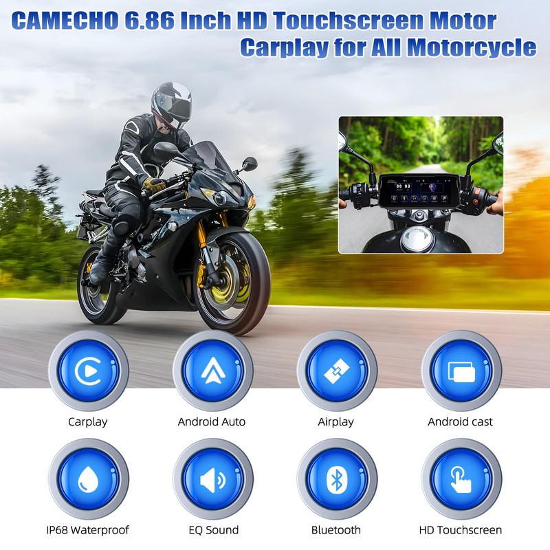 CAMECHO Wireless Carplay 6.86 Inch Moto Display with Android Car IP68 Waterproof, Touchscreen Navigator with Bluetooth Airplay Android Cast EQ Sound Wide Adaptability + 1280 x 480 HD