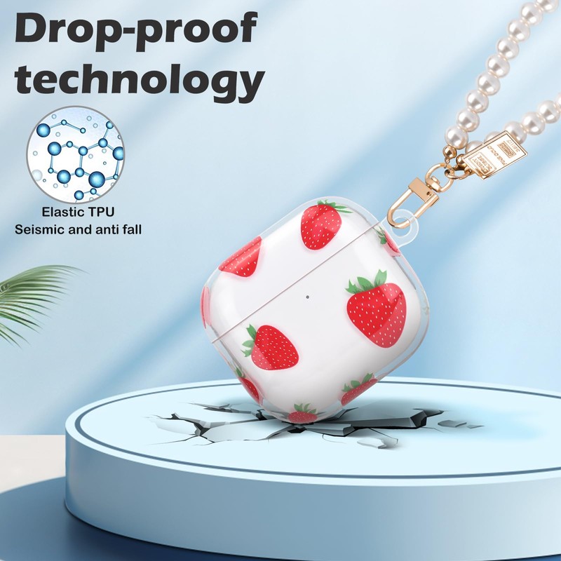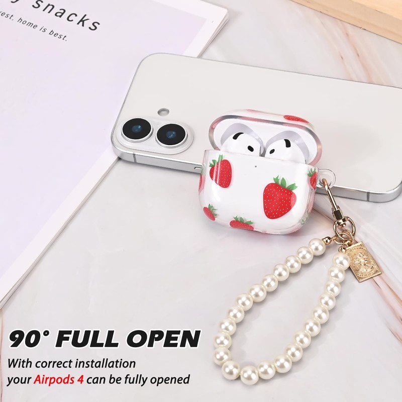 CameCosy for AirPods 4 Case with Pearl Bracelet, Cute Strawberry Design Protective Shockproof Clear TPU Premium Cover for AirPods 4th Generation for Women
