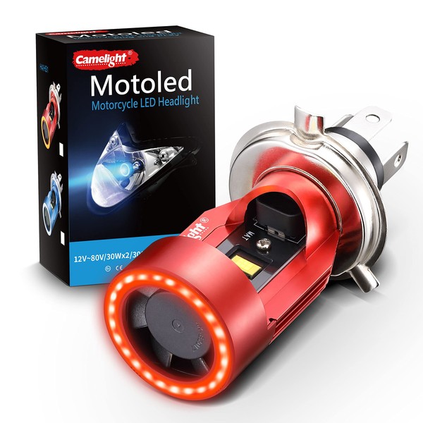 - High Quality: The LED motorcycle headlight with Angel Eye is the latest patented Camelight's latest product. Built-in silent fan ensures a 20,000 hour service life. Each piece passes rigorous temperature tests for high and low temperatures. Buy with confidence! The high density light beam of LED motorcycle headlights has a stronger transmission power than the original H4 halogen lights and ensures a wider field of view. Riding safer