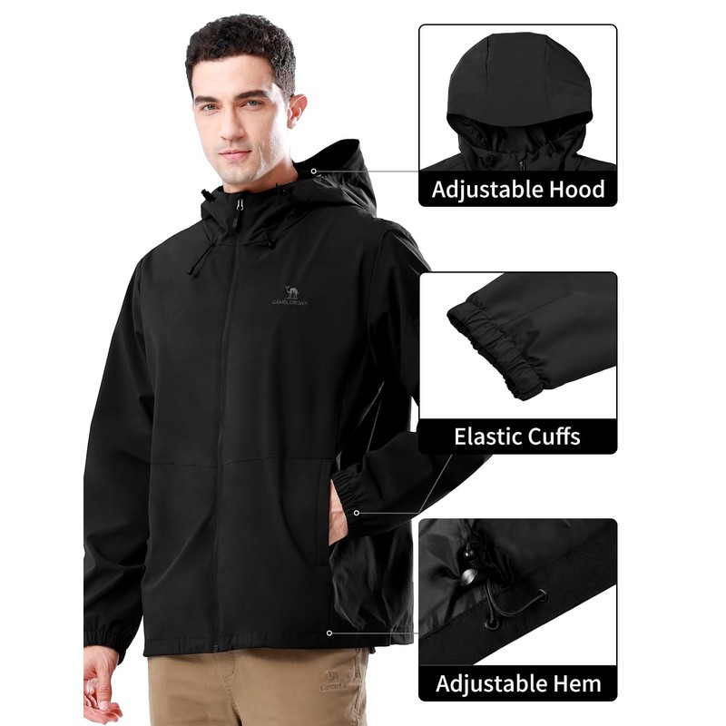 CAMELSPORTS Men Waterproof Softshell Jacket Windbreaker Hooded lightweight Rain Coat for Outdoor Hiking Black small