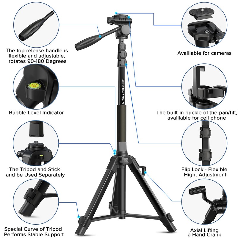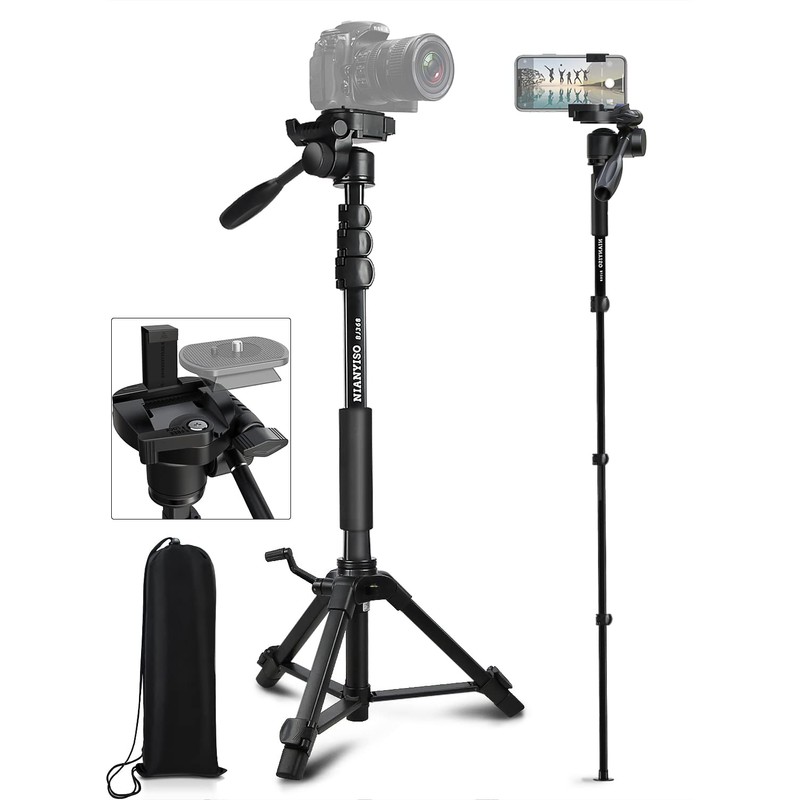 - 【Multifunctional Three-way Pan/Tilt】 360°rotating, adjustable-angle pan/tilt allows you to take panoramic photos/videos at will. Camera tripod has a 360° rotation function, allowing tilt and rotation movements; portrait or landscape options. NIANYISO Tripod has an exclusive patent and is equipped with a quick release plate, It can convert a camera tripod to a phone tripod without installing anything. Simply pull out the built-in buckle of the pan/tilt, it can be used as phone tripod