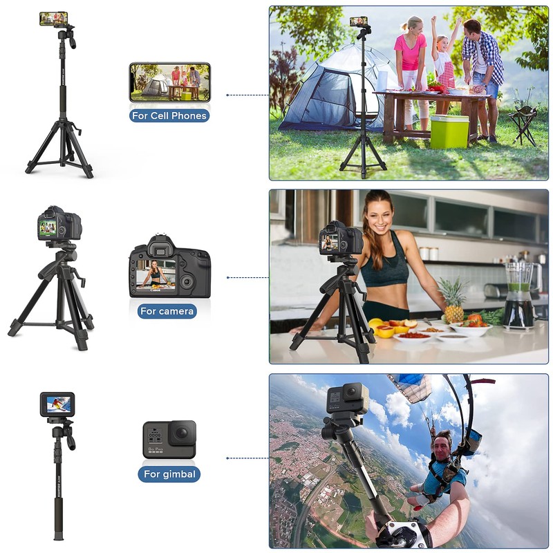 - 【Adjustable-height Matches Your Needs】 Camera stand can expand from 10.2 inches to 69.6 inches, which is suitable for children and adults. universal 1/4" screw can support most cameras like Canon Nikon. When used as phone tripod, it can take photos and videos, live broadcast, facetime, do the vlog, self-taking, tiktok.