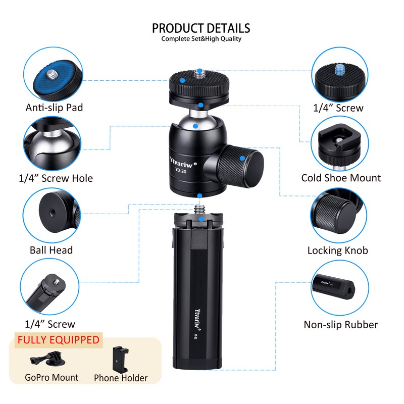 - 【PORTABLE TO USE】With the small size(1.25*1.25*2.5 inch) and light weight 3.95oz, the Ytvariw tripod ball head is save space and easy to carry,convenient for outdoor photography and vlogging.