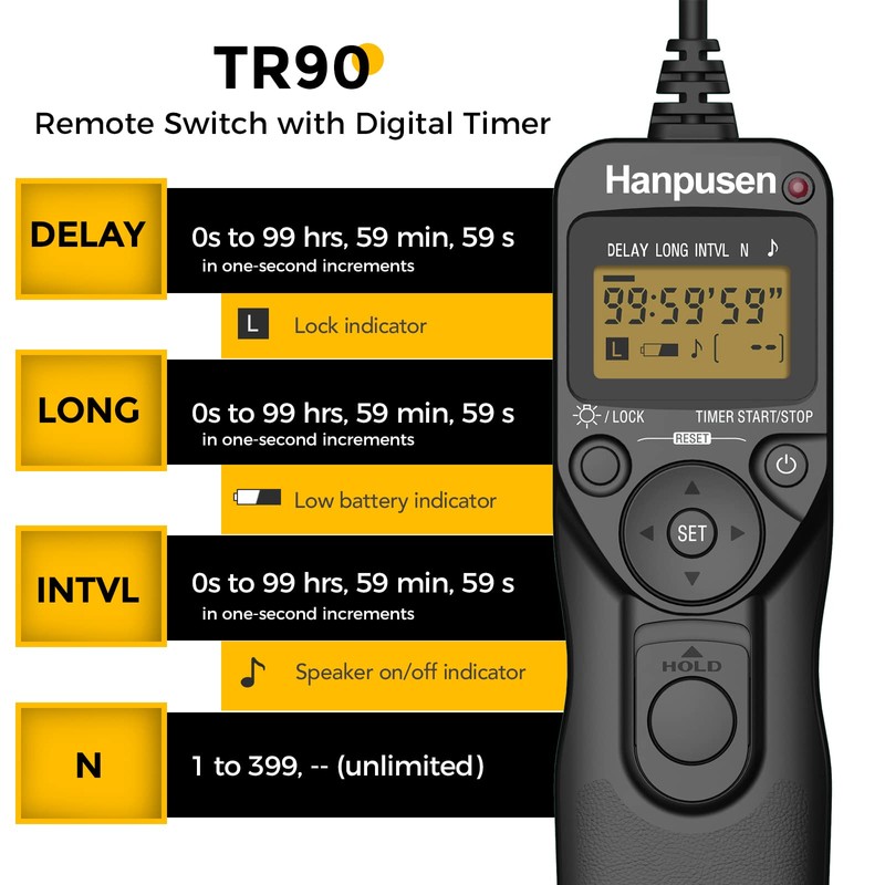 - Main functions: Timing control of shutter and exposure time. Support interval timer, long exposure, self timer, exposure count control and remote switch function.