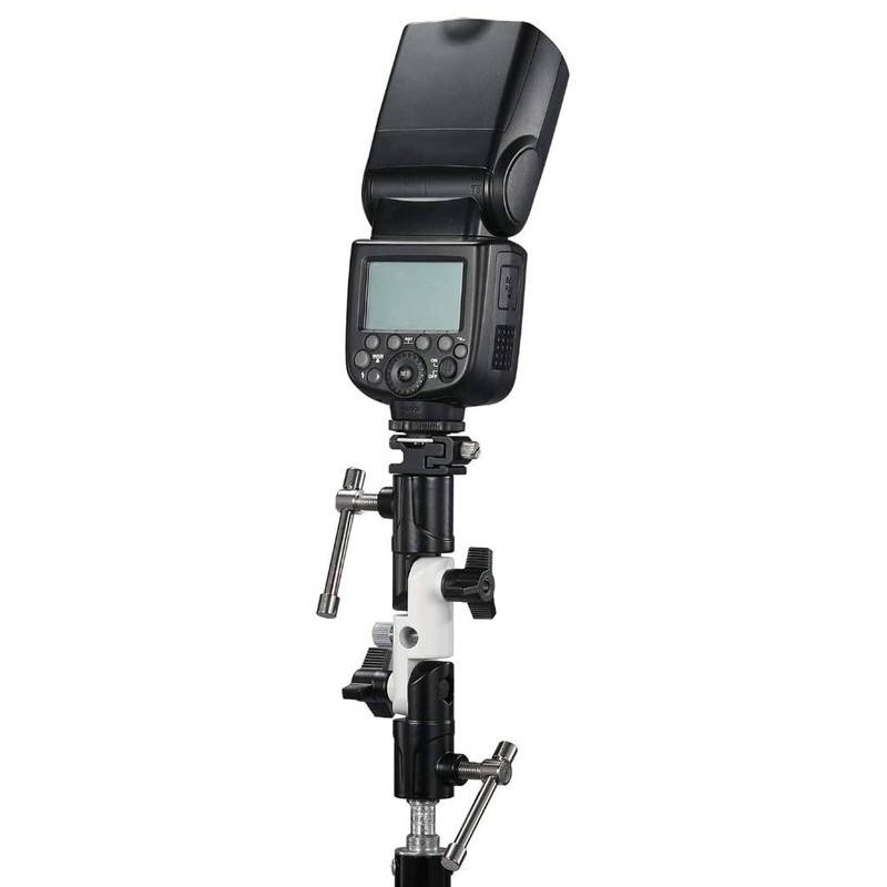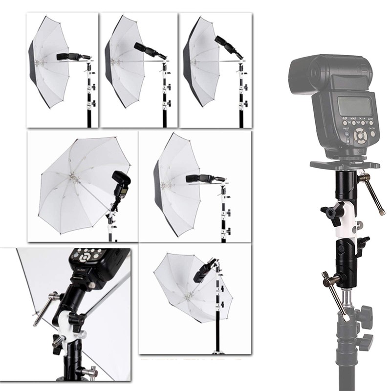 - TRIPLE HEAD DESIGN: With three independent adjustable metal hot shoe and 2 ratating section that allow 180 degree setting, the flash bracket can support different types of flash and offer more flexible operation experience for you, you can position the umbrella and flash in different angle, and offer the best brightness for you.