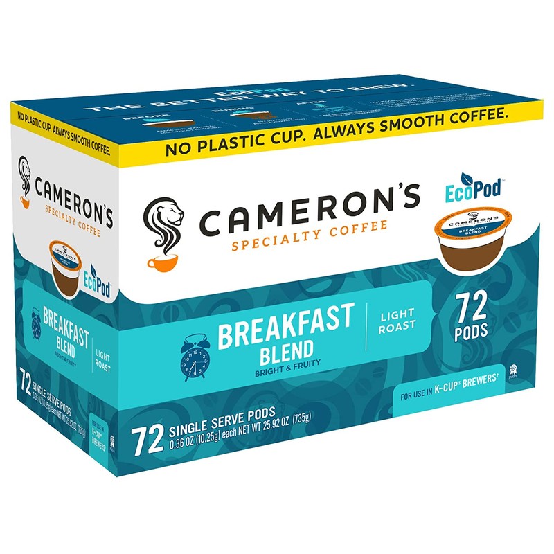 - QUICK AND EASY: One box of 72 Breakfast Blend single serve, compostable, coffee pods. Cameron's Coffee strives to provide the convenience of a single serve pod with the quality of café brewed coffee.