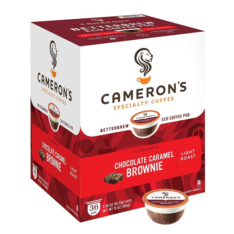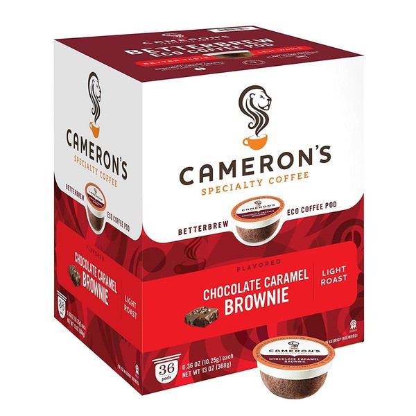 - QUICK AND EASY: One box of 36 Chocolate Caramel Brownie single serve, compostable, coffee pods. Cameron's Coffee strives to provide the convenience of a single serve pod with the quality of café brewed coffee.