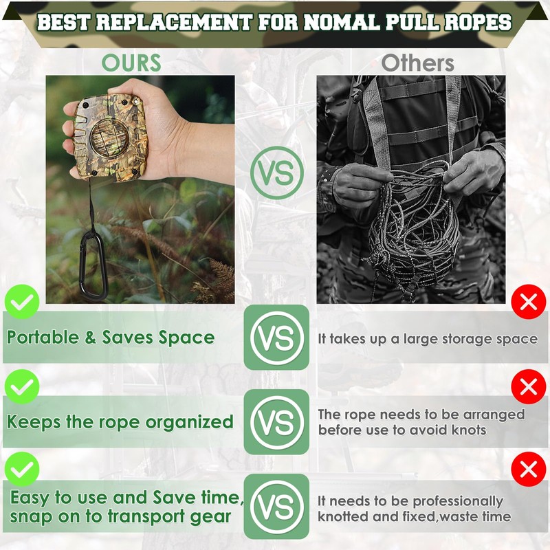 - Versatile, Durable, and Lightweight:Crafted with high-quality materials, our gear Hunting Rope Hoist guarantees longevity and efficiency as part of your tree stand gear hoist setup. It supports up to 60 pounds, help quick and easy pull up the hunting gear. The treestand rope hoist is easy to carry and store, ideal for both tree stand hunting and deer hunting equipment, our retractable bow rope for treestand ensures quick and easy access to your hunting gear