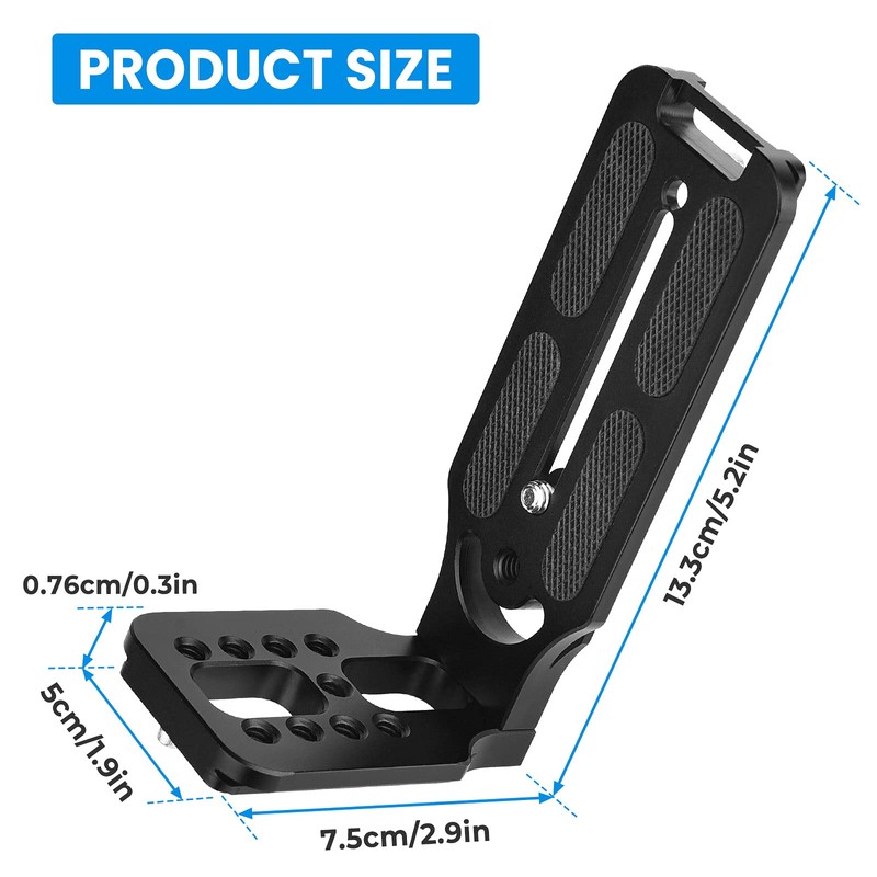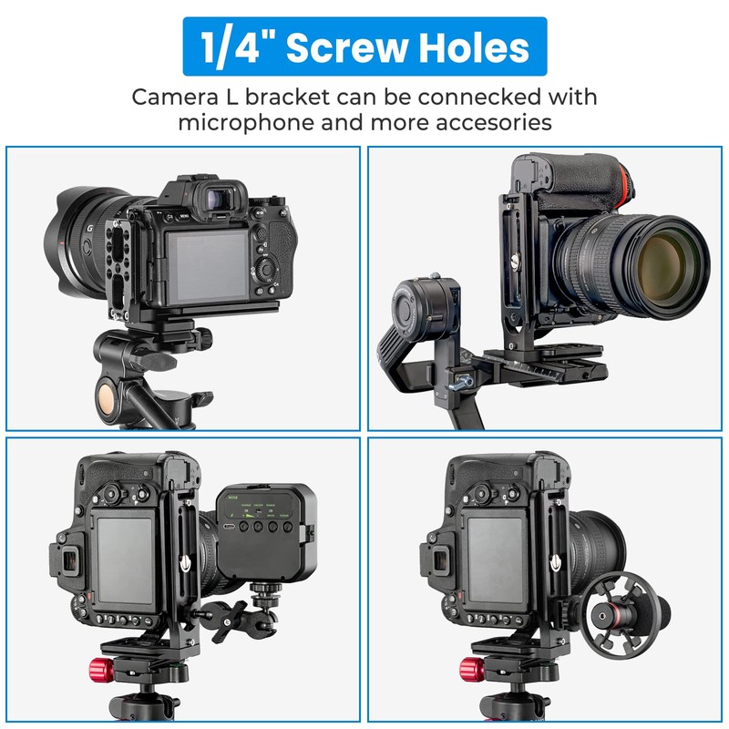 - Universal L-bracket: This L-bracket is equipped with a short Arca Swiss standard quick release plate and a long L-shaped quick release plate. This camera mount is compatible with most Arca-Swiss standard DSLR cameras. This camera mount is compatible with Canon EOS 80D T6 5D Mark i 6D 60D 7D 70D 77D D800 T6i 1300D Sony a7riii a7rii A7S a6000/6300/6500 Nikon D750 D850 D3400/3300 0/560 0/5300 D7200 GH3/4/5 etc.