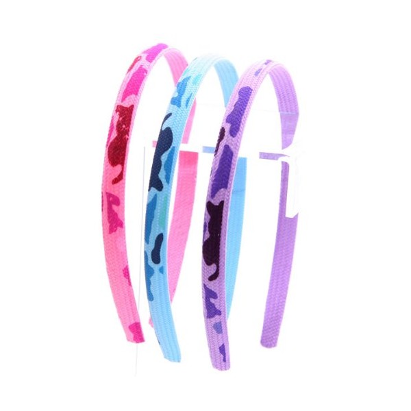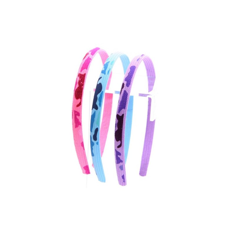 Each Headband pack contains 2 plastic headbands covered in a bright synthetic camouflage fabric.