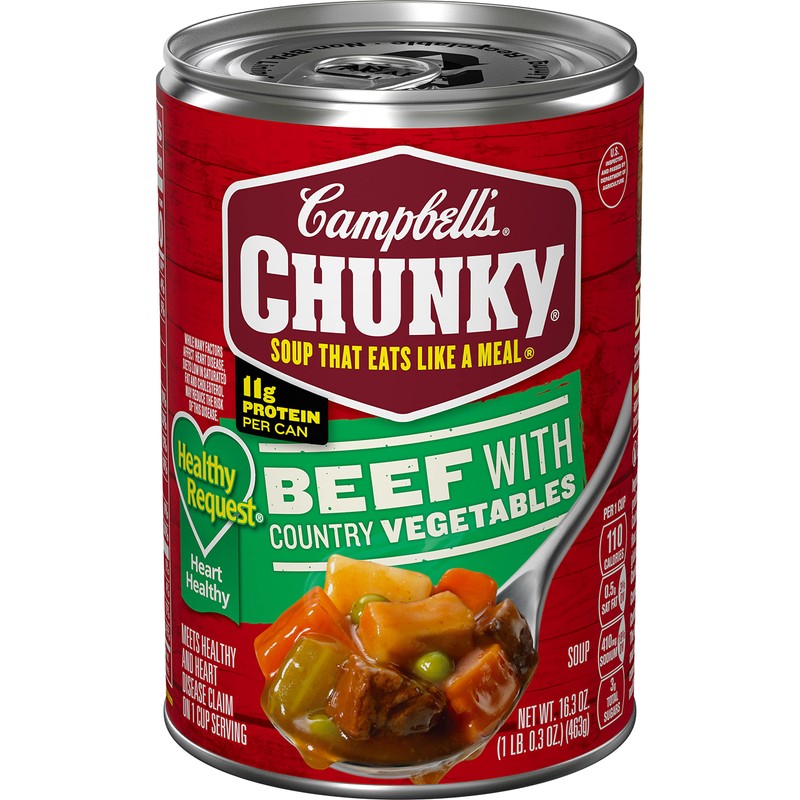 - Campbell's Chunky Soup: One (1) 16.3 oz can of Campbell’s Chunky Healthy Request Beef Soup with Country Vegetables