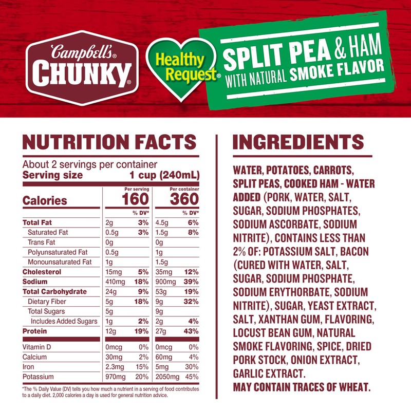 Campbell's Chunky Healthy Request Split Pea & Ham with Natural Smoke Flavor Soup features good-for-your-heart spoonfuls of this ready to eat soup that fill you up without weighing you down. Expect big pieces of potatoes and carrots accenting the subtle flavors of classic split peas, while hunks of cooked ham add an unforgettable smoky and meaty touch to our soul-warming soup. Campbell's Chunky Healthy Request Split Pea & Ham with Natural Smoke Flavor Soup—Soup That Eats Like a Meal. When you need food that works as hard as you do, grab Campbell's Chunky soups. Our big flavor, big pieces and bold ingredients will help you fight back when NFL-sized hunger hits. Available in hearty varieties and tastes that don’t stop, Campbell's Chunky soups fill you up and fuel your everyday hustle.