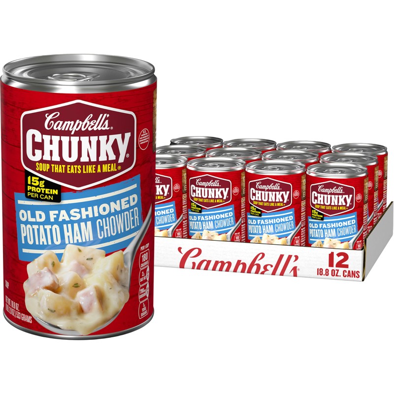 - Campbell's Chunky soup: twelve (12) 18.8 oz cans of Campbell’s Chunky old fashioned potato ham chowder