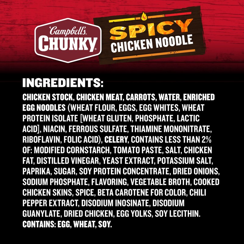 - Big Flavors: Spicy soup crafted with big pieces of chicken meat without antibiotics, carrots, celery, enriched egg noodles and a sizzling broth seasoned with chili pepper (1) and paprika (1) extract