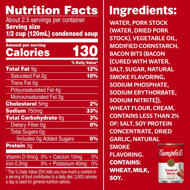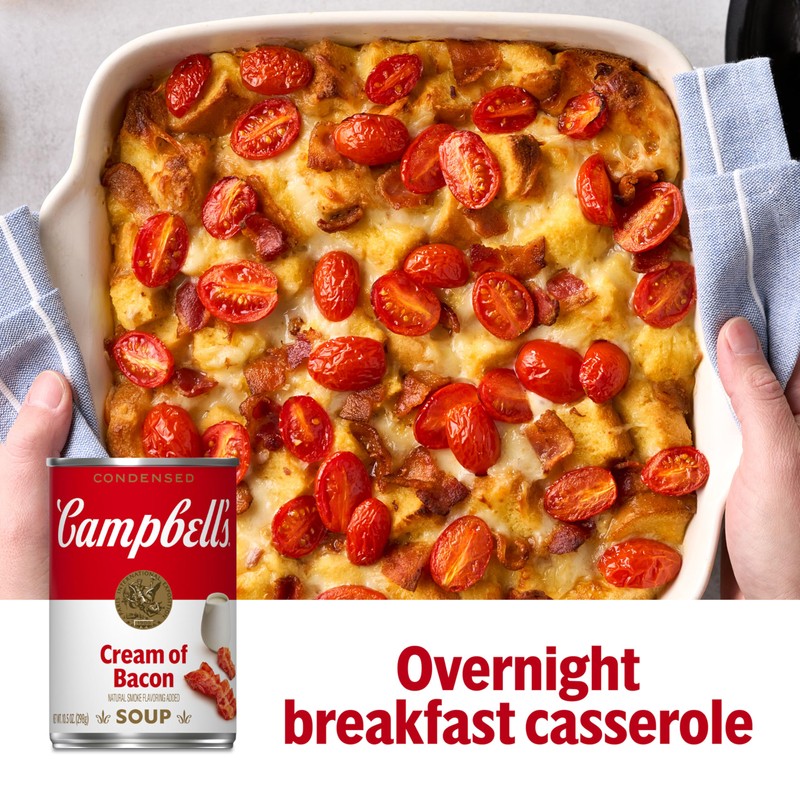 Add rich, creamy flavor to your favorite dishes with Campbell's Condensed Cream of Bacon Soup. It's crafted with bacon and farm-fresh cream to provide a delicious foundation to any recipe. Use it as a hero ingredient in classic dishes like overnight breakfast casserole, or substitute it for roux or bechamel as a sauce starter. This convenient canned soup is a year-round pantry staple and a must-have for creating something quick and easy. It's also delicious on its own, topped with fresh herbs or a drizzle of olive oil, or enjoyed with a sandwich or salad. Simply mix the condensed soup with 1 can of milk and microwave on high for 3 to 3.5 minutes in a covered, microwave-safe bowl, or heat in a pot on the stove, stirring occasionally. Each 10.5-ounce recyclable can contains about 2.5 servings of microwave soup and features an easy-open pop top and a non-BPA lining. From Cream of Bacon to Chicken Noodle and everything in between, Campbell's makes delicious soups in flavors your family knows and loves, with quality, farm-grown ingredients in every can. M'm! M'm! Good!