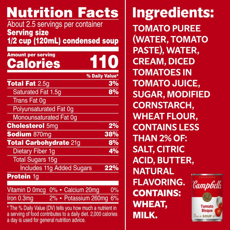 Campbell’s Condensed soups—Made for Real, Real Life. From Chicken Noodle to Tomato and everything in between, we make delicious soups with quality, farm- grown ingredients in flavors you and your family know and love. Whether Campbell’s Condensed soups are your secret ingredient in recipes or you want to simmer down with the perfect bowl, we have a soup for everyday that everyone can enjoy. When you grab the familiar red and white can, know you’re grabbing a trustworthy brand that lacks artificial flavors and colors. Campbell's Condensed Tomato Bisque is a delicious, indulgent twist on our classic tomato soup crafted with cream and tasty tomato pieces. Simmer down with a steamy bowl and savor every last spoonful.