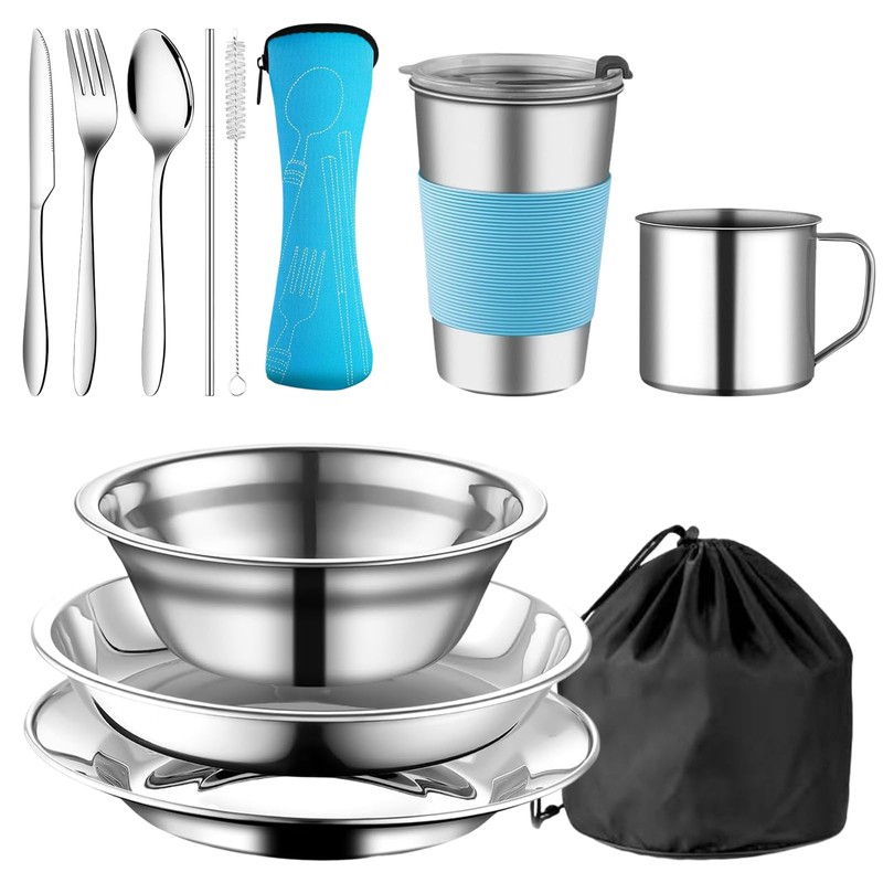 Camping Crockery Cutlery Set 10-Piece Stainless Steel Camping Cutlery for 2 People, Outdoor Travel Cutlery for Hiking and Picnic, Blue