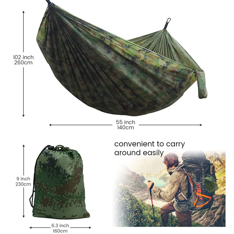 - ✔【Lightweight & Portable】This camping hammock set comes with a storage bag. All components fit into a storage bag and lightweight to carry. When your hammock is not used, your can fold it into this storage bag for portable backpacking, space-saving storage for easy carry. Perfect for camping, hiking, backpacking, travel, sporting events, emergency survival, adventure, picnic, beach in all weather.