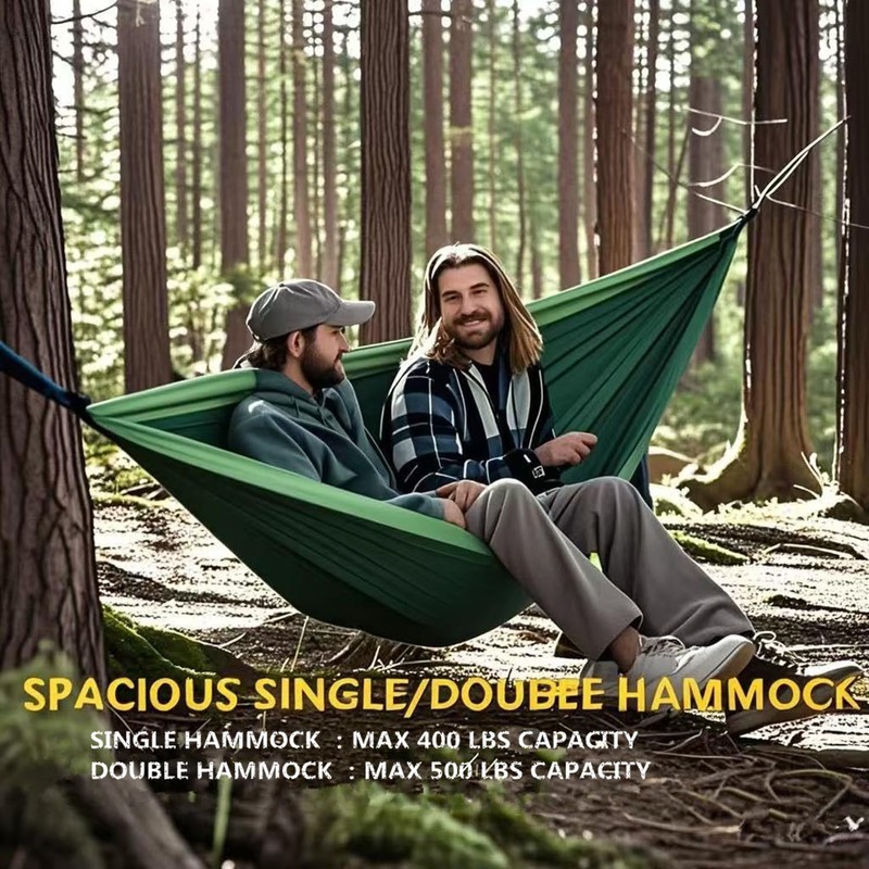 - 3. SPACIOUS DOUBLE HAMMOCK (400 LBS CAPACITY): Generous 106.3" x 55.1" size comfortably fits 2 adults , with a 400 lbs weight limit. Ideal for camping, hiking, beaches, or backyard chilling—offering roomy comfort without bulk.