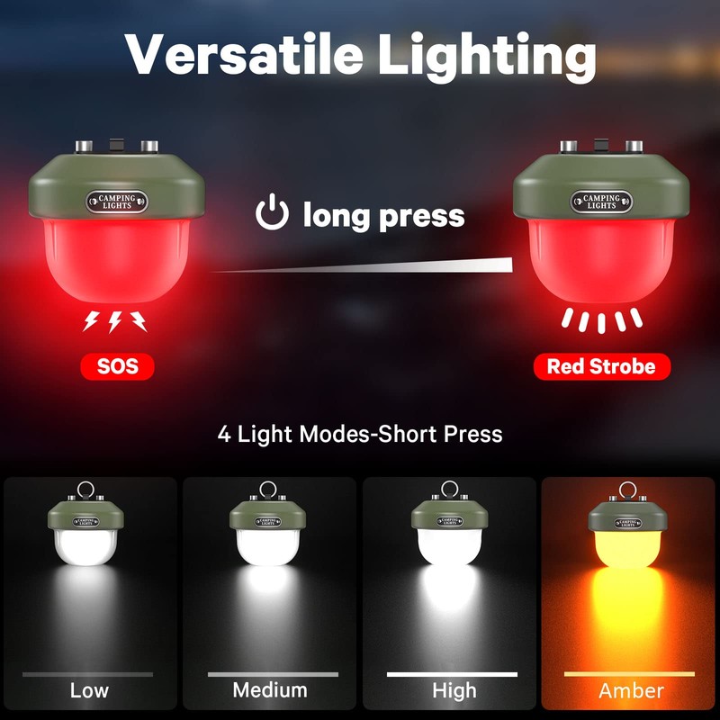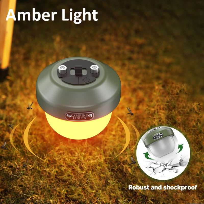 - 🍀【Multifunctional LED Tent Lantern】With its 6 modes, the camping lamp can be used in a variety of ways. Shortly press once to three times for white flood light: Low-Medium-High (as a camping night light) and a fourth time for amber light, which has lower attractiveness to insects. For emergency lighting, long-press for 3s for red light (SOS-Slow Strobe). One-button switch to fully meet your requirements.