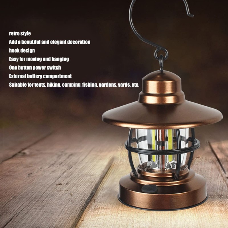 Camping Lantern, Retro Warm Camp Light, Battery Powered Metal Vintage Hanging Lamp, Camping Vintage Hook Design One Button Switch 3 COB