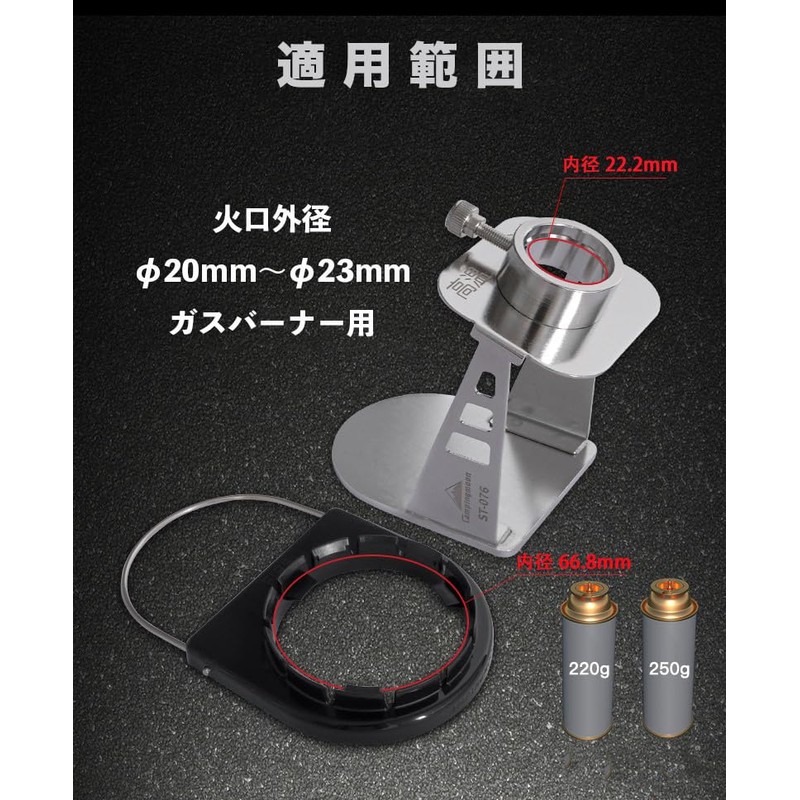 • Applications: For use with Campin Moon MT-2930, Shinfuji Burner, Power Torch, etc., torch burners with an outer diameter of 0.8 - 0.9 inches (20 - 23 mm)