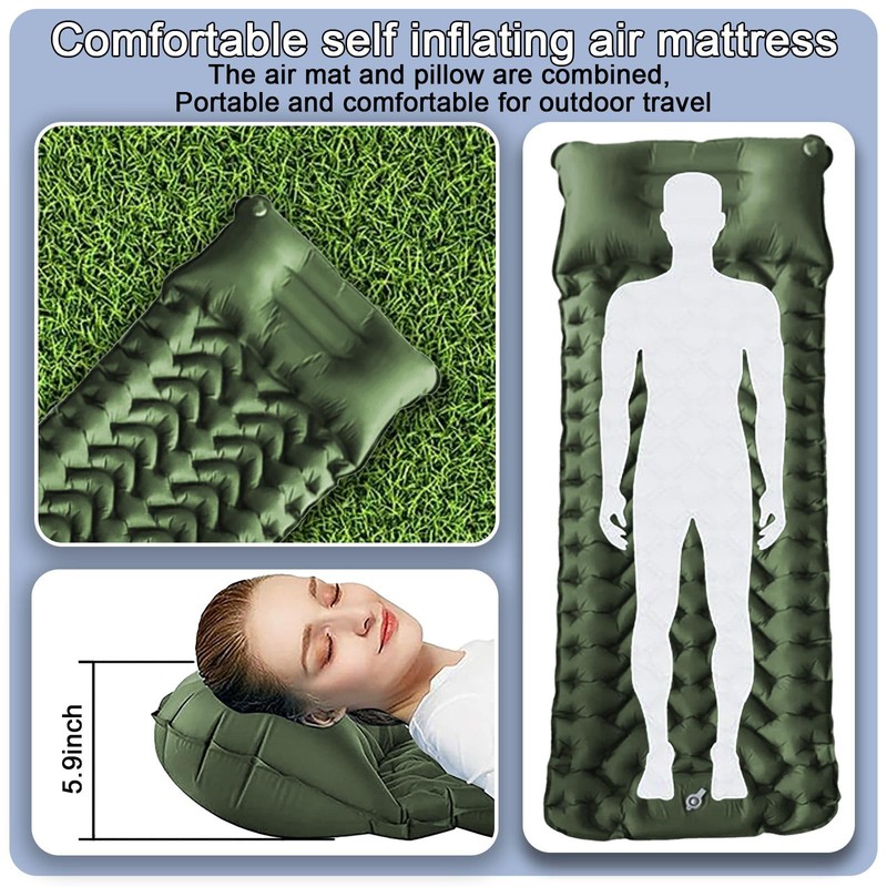 Camping Sleeping Pad,10cm Thick Sleeping Air Mattress with Pillow,Self Inflating Camping Sleeping,Compact Mattress Pad Built-in Foot Pump for Backpacking, Hiking, Traveling (Green, Single)