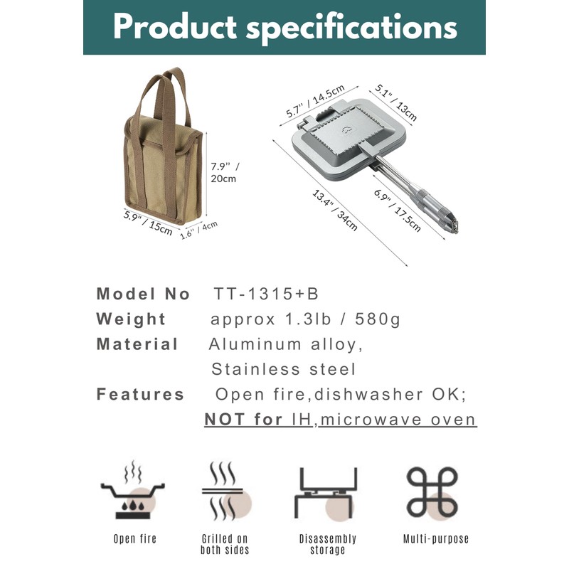 - 【Detachable Handles for Convenience】Featuring removable handles, this toaster provides added convenience for storage, transport, and cleaning, allowing you to customize your outdoor cooking experience effortlessly. Storage bag includes an inner pocket for the handle pole of the TT-1315, allowing for hygienic storage of the entire handle.
