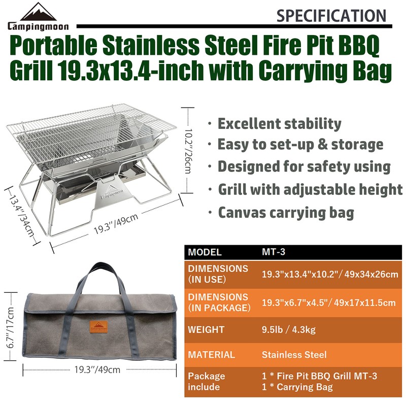 - *OUTDOOR USE ONLY* ①Sturdy and long life with a thick stainless steel frame. ②2 levels adjustable height of the grill, so you can control the heat for cooking. ③Package include: 1 * Fire Pit BBQ Grill MT-3; 1 * Carrying Bag